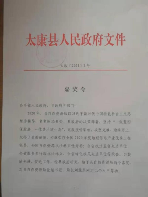 嘉獎令稱,2020年,太康縣自然資源局以習(xí)近平新時代中國特色社會主義思想為指導(dǎo),緊緊圍繞縣委、縣政府的決策部署,堅持“一張藍(lán)圖保發(fā)展、一體共治建生態(tài)”,克服疫情影響,攻堅克難,迎難而上。相繼榮獲全國地理信息產(chǎn)業(yè)優(yōu)秀工程銀獎、全國執(zhí)法卷宗優(yōu)秀卷;全省執(zhí)法監(jiān)督先進(jìn)單位、全省服務(wù)型行政執(zhí)法標(biāo)兵單位、全省綠化模范先進(jìn)單位等榮譽(yù)。