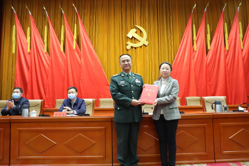 會議在莊嚴(yán)的國歌聲中開始。李揚宣布了趙丹擔(dān)任項城市人武部黨委第一書記任職命令,車曉輝政委為趙丹頒發(fā)了任職書。