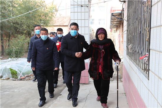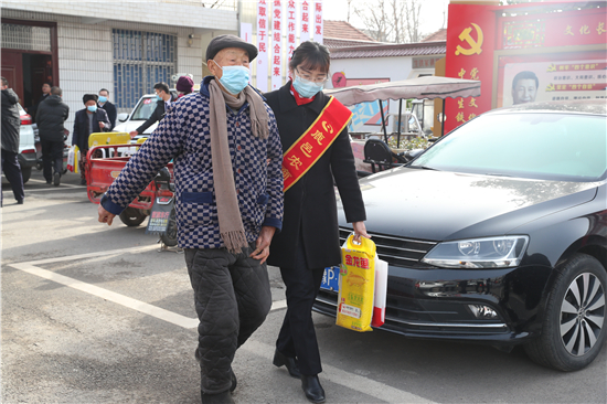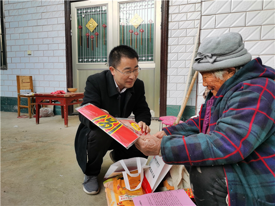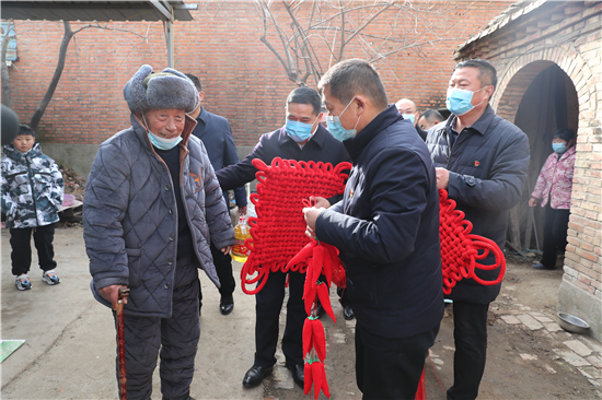 在鄭家集鄉(xiāng)韓樓村,縣農(nóng)商銀行鄭家集支行行長(zhǎng)武繼龍帶領(lǐng)員工來(lái)到92歲韓老漢的家中,看到韓老漢由于身體原因只能靠拐棍佝僂著背站著,武繼龍緊忙彎腰俯下身說(shuō):“大爺,快過(guò)年了,我們來(lái)看看您,提前給您拜個(gè)早年!”“真的是太感謝恁了,這么冷的天,還讓你們來(lái)送到家里面。”韓老漢激動(dòng)地說(shuō)。