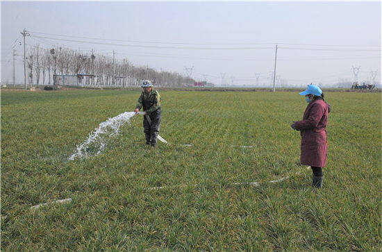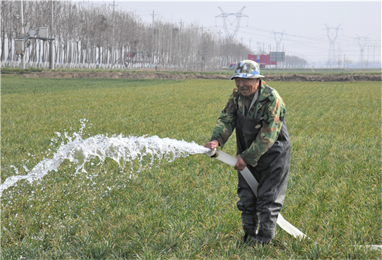 春節(jié)前夕,豫東大地旱象抬頭,全國超級產(chǎn)糧大縣商水縣農(nóng)業(yè)部門一邊聘請市、縣專業(yè)技術(shù)人員實(shí)地指導(dǎo),一邊動(dòng)員農(nóng)民迅速投入以抗旱澆麥、化學(xué)除草為重點(diǎn)的麥田管理工作。許多農(nóng)民匆匆買完年貨就開始下地抗旱澆麥,隨處可見農(nóng)民運(yùn)水泵、擺管子、疏溝渠的身影,萬頃麥田一派繁忙景象。