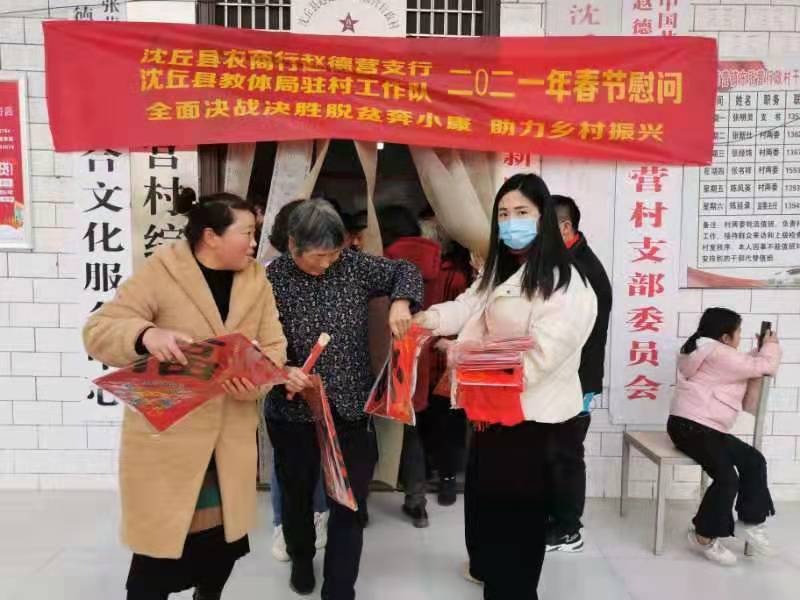 村室外邊,縣教體局駐村工作隊(duì)長李小兵、村干部不停地把一幅幅火紅的春聯(lián)遞到村民的手上,并和大家互道祝福:“鄉(xiāng)親們,新年好,牛年好運(yùn)。”