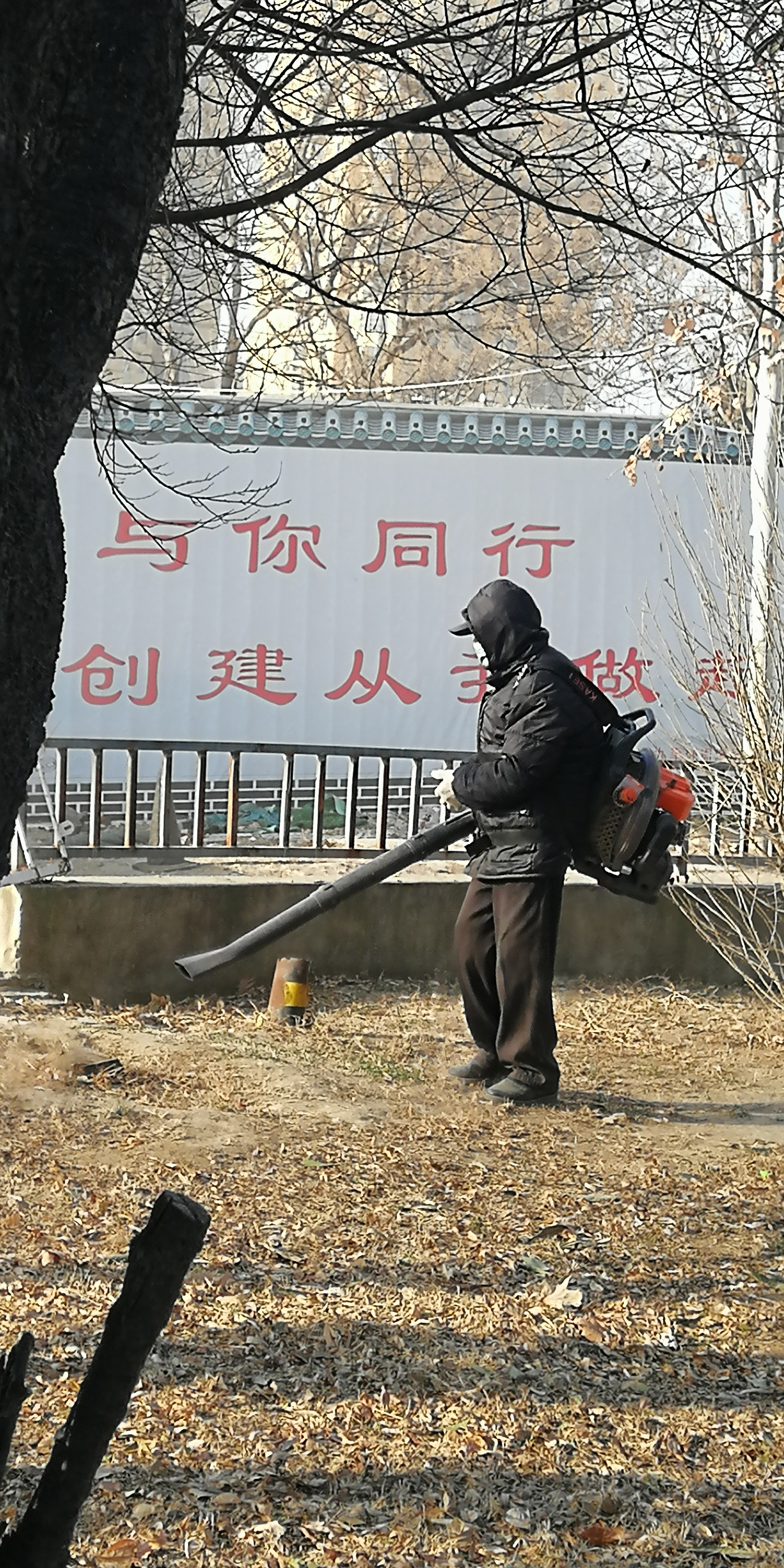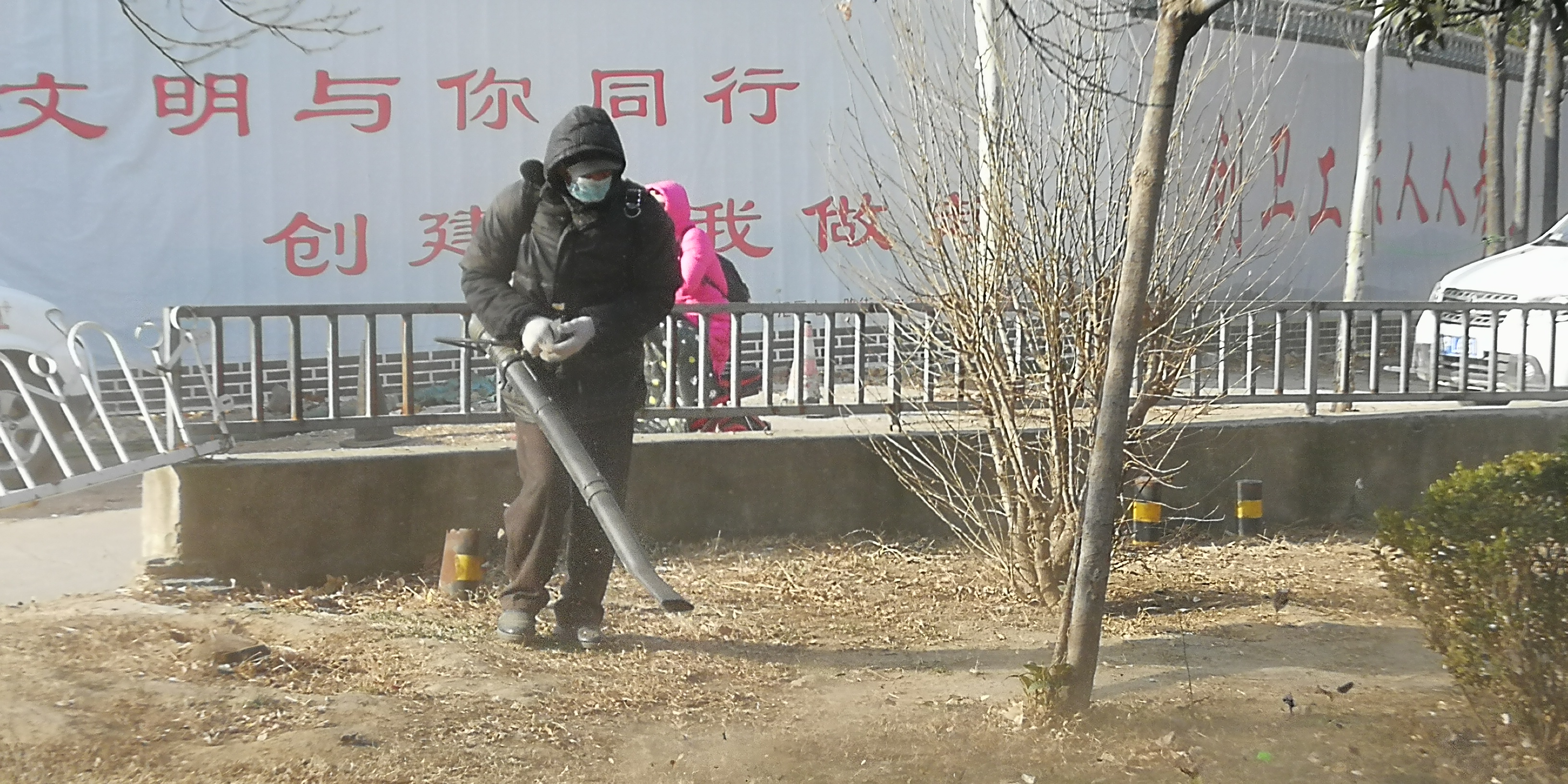 2月11日,大年三十。在川匯區(qū)濱河路上,工作人員背著吹風(fēng)機(jī)清理游園內(nèi)的落葉和垃圾。工作人員介紹,這樣便于更快更好地工作。(周口日報·周道客戶端記者 馬月紅)②7