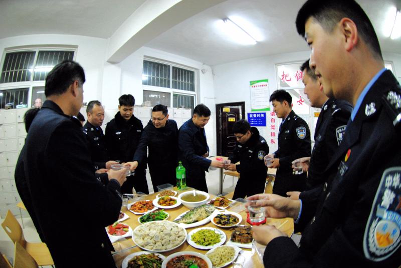 19時(shí)30分,在局機(jī)關(guān)餐廳,商水縣政府黨組成員、縣公安局黨委書記、局長王之棟,局黨委副書記、政委張俊華與在此值班備勤民警、輔警共度除夕夜。