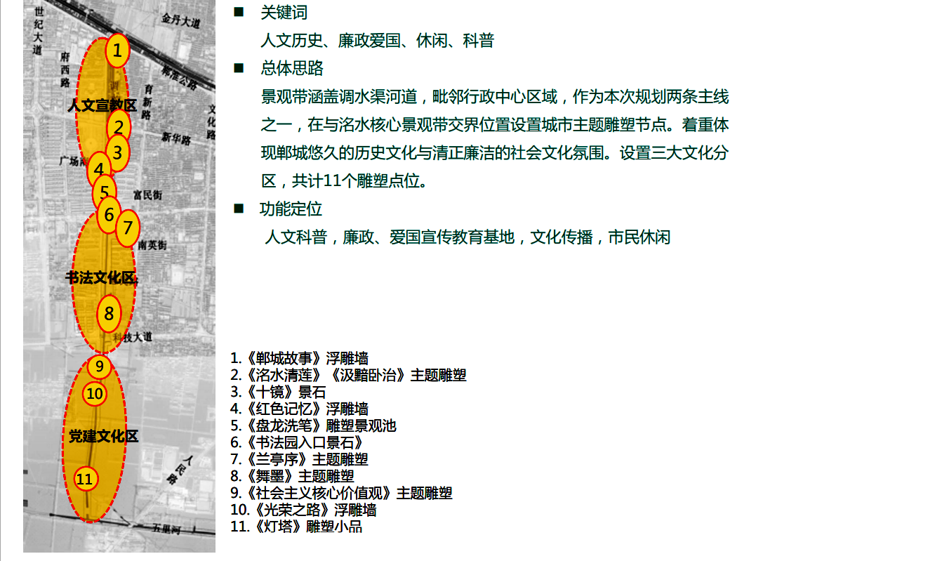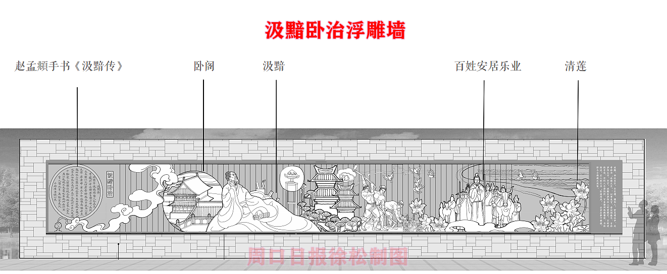 在縣委、縣政府綜合大樓東側(cè)的核心形象段,配合鄲城行政中心打造莊嚴、大氣氛圍的同時,對鄲城歷史文化進行了集中展示,包括鄲城的歷史沿革,鄲城的發(fā)展理念,歷史故事等。其中調(diào)水渠西側(cè)以現(xiàn)有人民廣場對應(yīng)的綠地為基礎(chǔ),設(shè)置了較多的歷史文化節(jié)點。如調(diào)水渠新華路橋頭北側(cè)的廉政文化廣場,講述了漢朝名臣汲黯的故事。汲黯為人耿直,直諫廷諍,親政愛民,敢于承擔責任,漢武帝劉徹稱其為“社稷之臣”。汲黯廉政廣場建設(shè)在此處更有著深遠的意義,它一方面提醒老百姓要了解歷史、敬畏先賢,同時也激勵著鄲城縣的各級黨員干部要在習近平新時代中國特色社會主義思想引領(lǐng)下,“不忘初心、牢記使命、廉潔奉公、一心為民”。