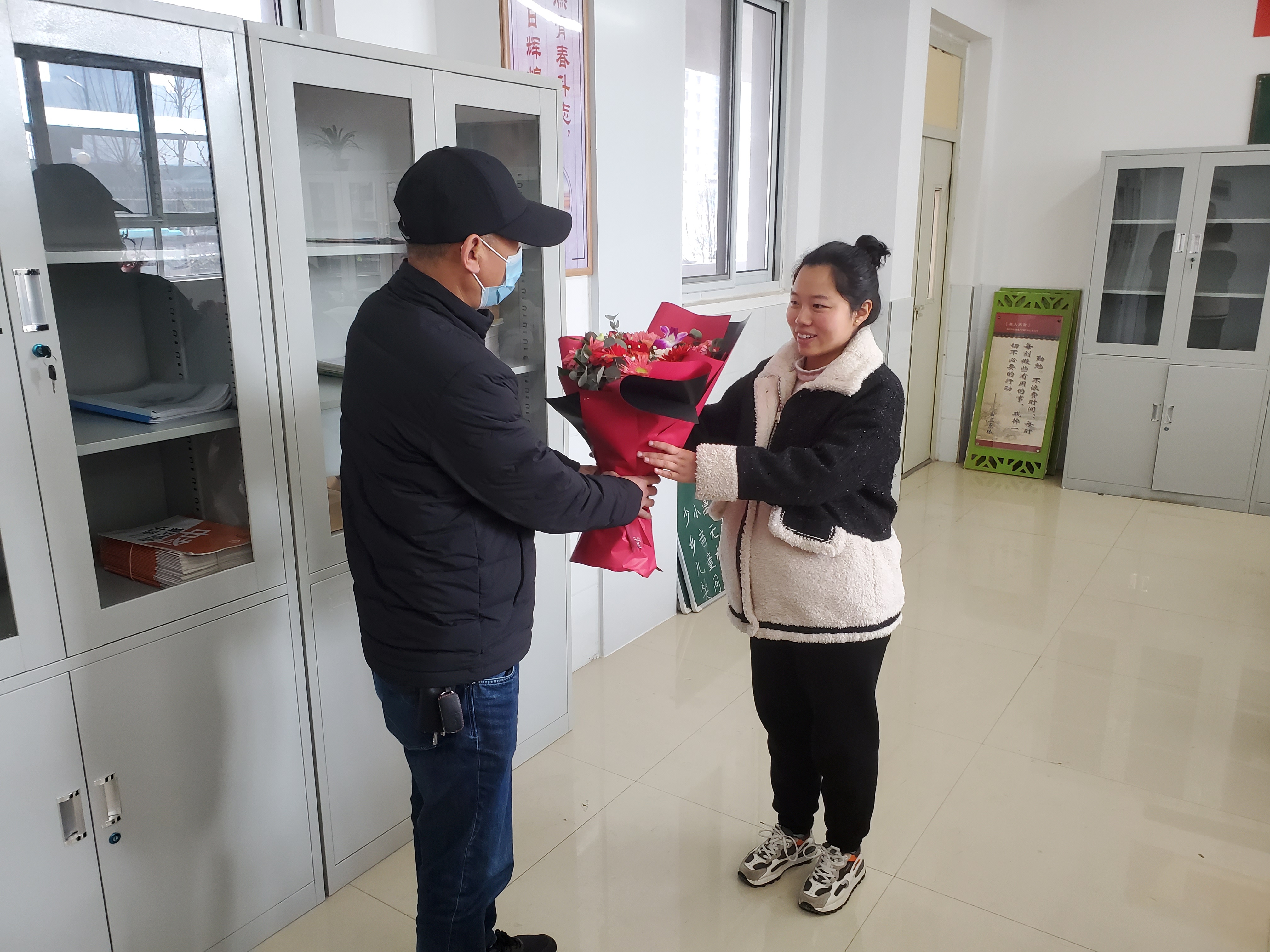 3月2日,教師辦公室里歡聲笑語,氣氛熱烈,學(xué)校校長文海泳帶領(lǐng)學(xué)校領(lǐng)導(dǎo)班子成員為今天過生日的袁老師送上一束鮮花并祝福她生日快樂。這是該校新學(xué)期開展的“教師過生日,學(xué)校送祝福”活動的一幕。