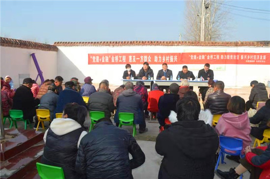 為認(rèn)真貫徹新時(shí)代黨的建設(shè)總要求,落實(shí)國家實(shí)施鄉(xiāng)村振興戰(zhàn)略,把踐行普惠金融與激發(fā)基層黨建活力進(jìn)一步結(jié)合起來,3月4日,西華縣東夏亭鎮(zhèn)聯(lián)合信用社在河灣行政村開展“黨建+金融”金橋工程活動(dòng)。該鎮(zhèn)人大主席王慶輝、西華縣信用聯(lián)社副主任閆杰、縣信用聯(lián)社信貸科科長周飛、鎮(zhèn)信用社主任鄭廣成等出席活動(dòng)。