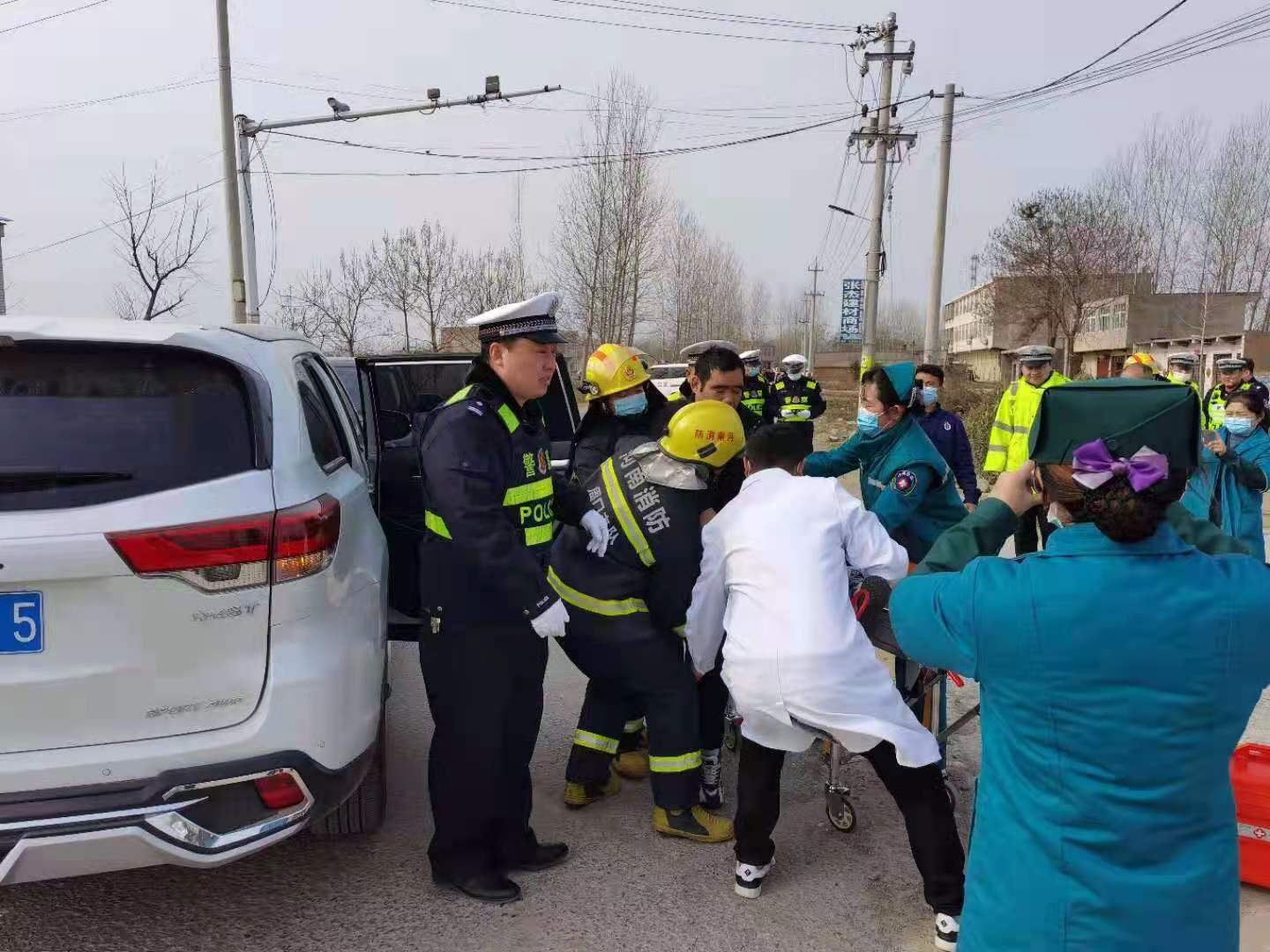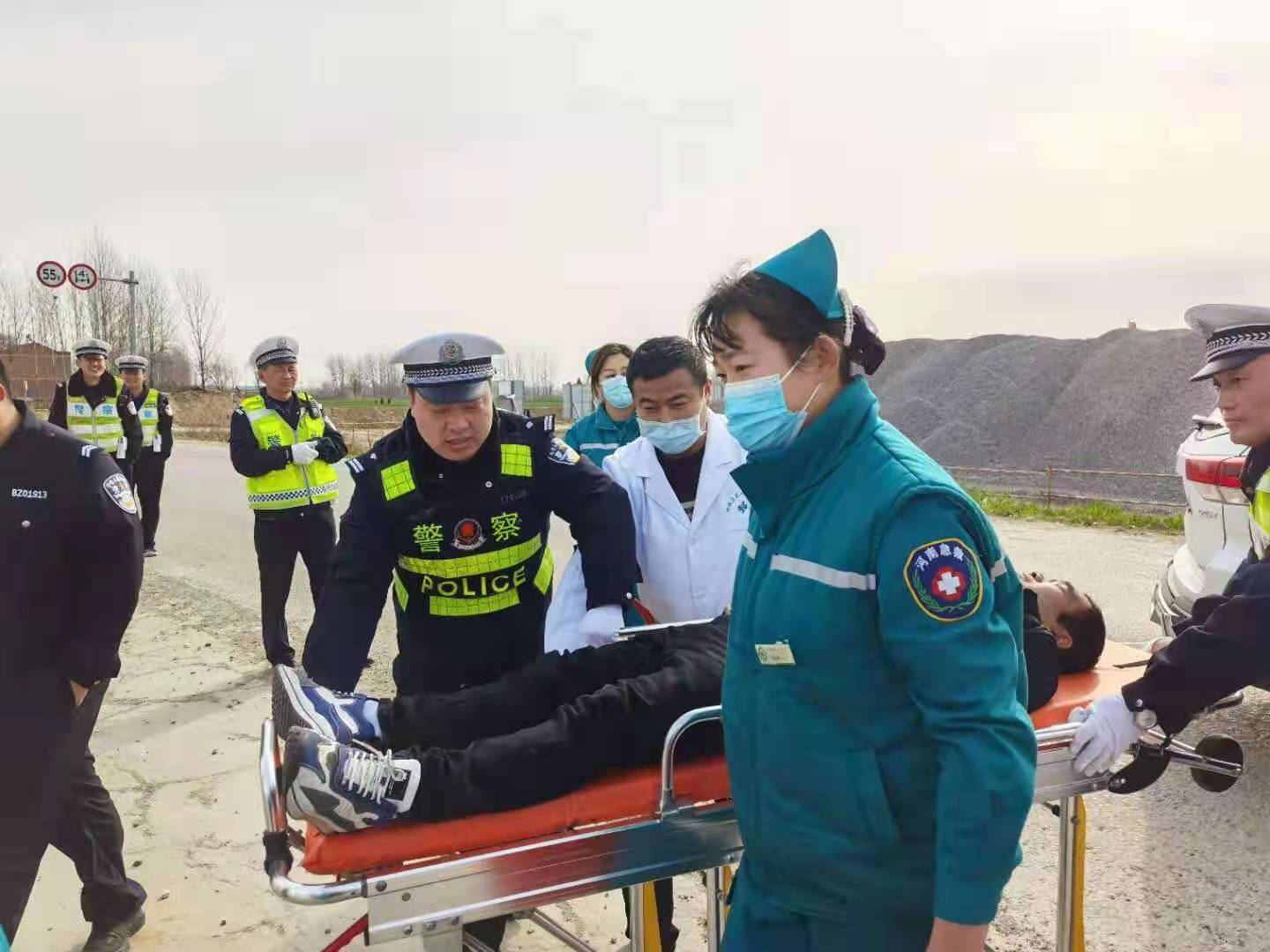 為防止和減少交通事故造成的人員傷害,檢驗(yàn)緊急情況下快速有效的聯(lián)合交通事故救援和應(yīng)急機(jī)制,3月10日上午8時(shí),河南省周口市鄲城縣交警大隊(duì)事故中隊(duì)聯(lián)系周口市淮陽(yáng)區(qū)交警大隊(duì)事故中隊(duì),鄲城縣消防應(yīng)急南豐中隊(duì),鄲城縣中心醫(yī)院與安徽省亳州市交警支隊(duì)四大隊(duì)雙溝中隊(duì)在豫皖兩省交界處,開展惡劣天氣聯(lián)合應(yīng)急處置演練、道路中斷聯(lián)合應(yīng)急處置演練和重特大事故聯(lián)合應(yīng)急處置演練。