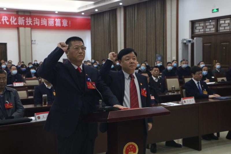 隨后,新當(dāng)選的扶溝縣人大常委會(huì)副主任王世學(xué)(左)、扶溝縣監(jiān)委主任李明朗,手撫《中華人民共和國(guó)憲法》,就職宣誓。