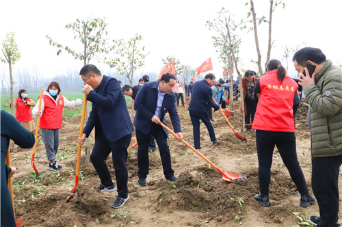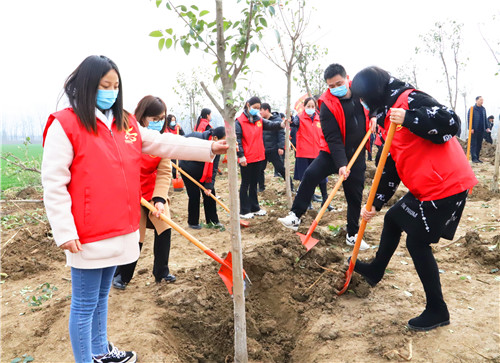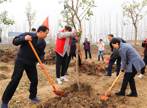 植樹(shù)現(xiàn)場(chǎng)一派熱火朝天的景象。羅文閣、李全林、王獻(xiàn)超、李建軍、王偉等身體力行,與大家一起扶正樹(shù)苗、揮鍬培土、分層踩實(shí)、堆起圍堰、提水澆灌,認(rèn)真地完成著每一道工序,栽下了一棵棵樹(shù)苗,為改善鄲城生態(tài)環(huán)境、綠化美麗家園種下了一棵棵綠色的希望。