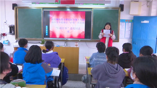 3月16日下午,川匯區(qū)荷花路街道辦事處新時(shí)代文明實(shí)踐所組織志愿者走進(jìn)第十八初級(jí)中學(xué),開(kāi)展春日“護(hù)苗”在行動(dòng) “掃黃打非”進(jìn)校園主題教育活動(dòng)。