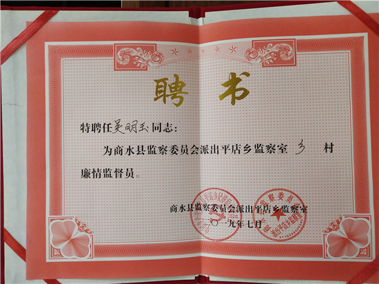 “我鄉(xiāng)劉樓村黨支部書記吳明玉敢于擔當,一身正氣,認真履行村干部的工作職責,在全鄉(xiāng)起了很好的示范作用,經(jīng)鄉(xiāng)紀委研究報請鄉(xiāng)主要領導同意,特對吳明玉進行通報表揚,即日起聘請吳明玉同志為平店鄉(xiāng)廉情監(jiān)督員。請吳明玉同志上臺接受聘書......”近日,商水縣平店鄉(xiāng)召開例會,縣紀委委員、鄉(xiāng)黨委副書記邵國闖宣讀了一份“特殊通報”,并當場頒發(fā)了聘書。