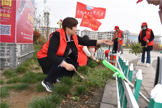 在項城市中心廣場,項城市工業(yè)路小學“黨旗紅”志愿服務隊的志愿者對綠化帶中的雜草進行清理,裸露的花草重新種植。用實際行動踐行“綠水青山就是金山銀山”的發(fā)展理念。