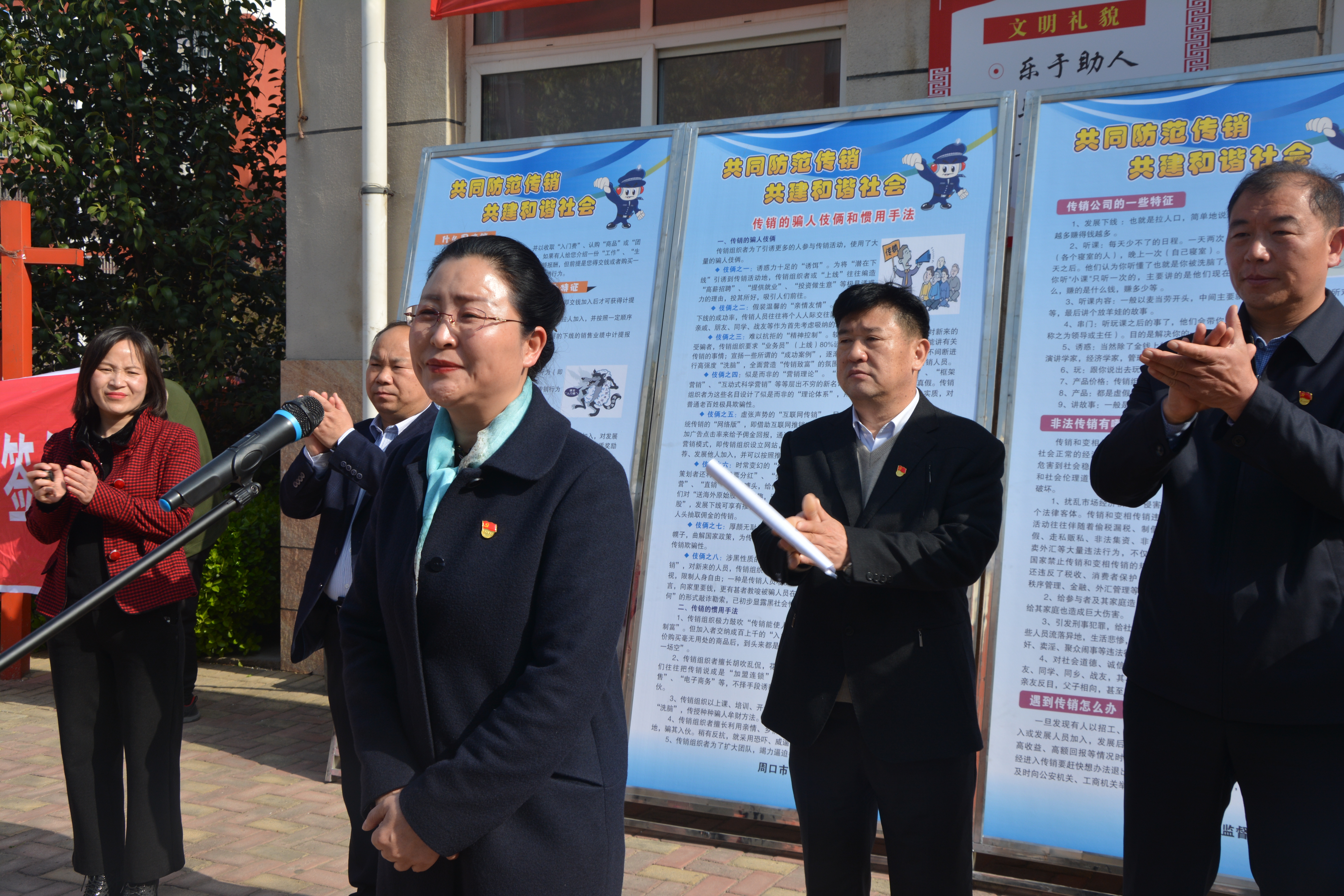 市市場(chǎng)監(jiān)管局二級(jí)高級(jí)主辦王樹(shù)平,港區(qū)打擊傳銷工作領(lǐng)導(dǎo)小組組長(zhǎng)、黨委委員、紀(jì)委書記李素芹出席活動(dòng),市市場(chǎng)監(jiān)管局公平交易科科長(zhǎng)豐亞偉、主任科員孟金鳳,港區(qū)管委會(huì)維穩(wěn)創(chuàng)新辦、安全辦、李埠口鄉(xiāng)政府負(fù)責(zé)人,周口市公安局港區(qū)分局民警輔警代表、各行政村分管同志、三個(gè)小區(qū)物業(yè)公司代表,市場(chǎng)監(jiān)管局港區(qū)分局全體同志,周口日?qǐng)?bào)社等新聞單位以及前來(lái)參觀的群眾參加了活動(dòng)。港區(qū)打擊傳銷工作領(lǐng)導(dǎo)小組辦公室主任、市場(chǎng)監(jiān)管局港區(qū)分局局長(zhǎng)崔健作創(chuàng)建動(dòng)員講話。他指出,嚴(yán)厲打擊傳銷違法行為,增強(qiáng)廣大群眾識(shí)別傳銷、抵制傳銷的能力,發(fā)動(dòng)社會(huì)力量群防群控,是加強(qiáng)平安建設(shè),打造平安港區(qū),進(jìn)一步促進(jìn)社會(huì)和諧穩(wěn)定的重要舉措。開(kāi)展無(wú)傳銷社區(qū)村創(chuàng)建活動(dòng),就是動(dòng)員全社會(huì)特別是基層派出所、市場(chǎng)監(jiān)管所、社區(qū)(村)等力量,展開(kāi)群防群控,重點(diǎn)加強(qiáng)對(duì)流動(dòng)人口密集、情況復(fù)雜區(qū)域的檢查力度,形成縱橫交錯(cuò)、內(nèi)外結(jié)合、上下聯(lián)動(dòng)的網(wǎng)格體系,全力擠壓傳銷活動(dòng)生存空間,始終保持對(duì)傳銷的高壓態(tài)勢(shì),增強(qiáng)群眾抵制傳銷的自覺(jué)性和積極性,鏟除傳銷滋生的土壤,推進(jìn)打擊傳銷工作再上新臺(tái)階。