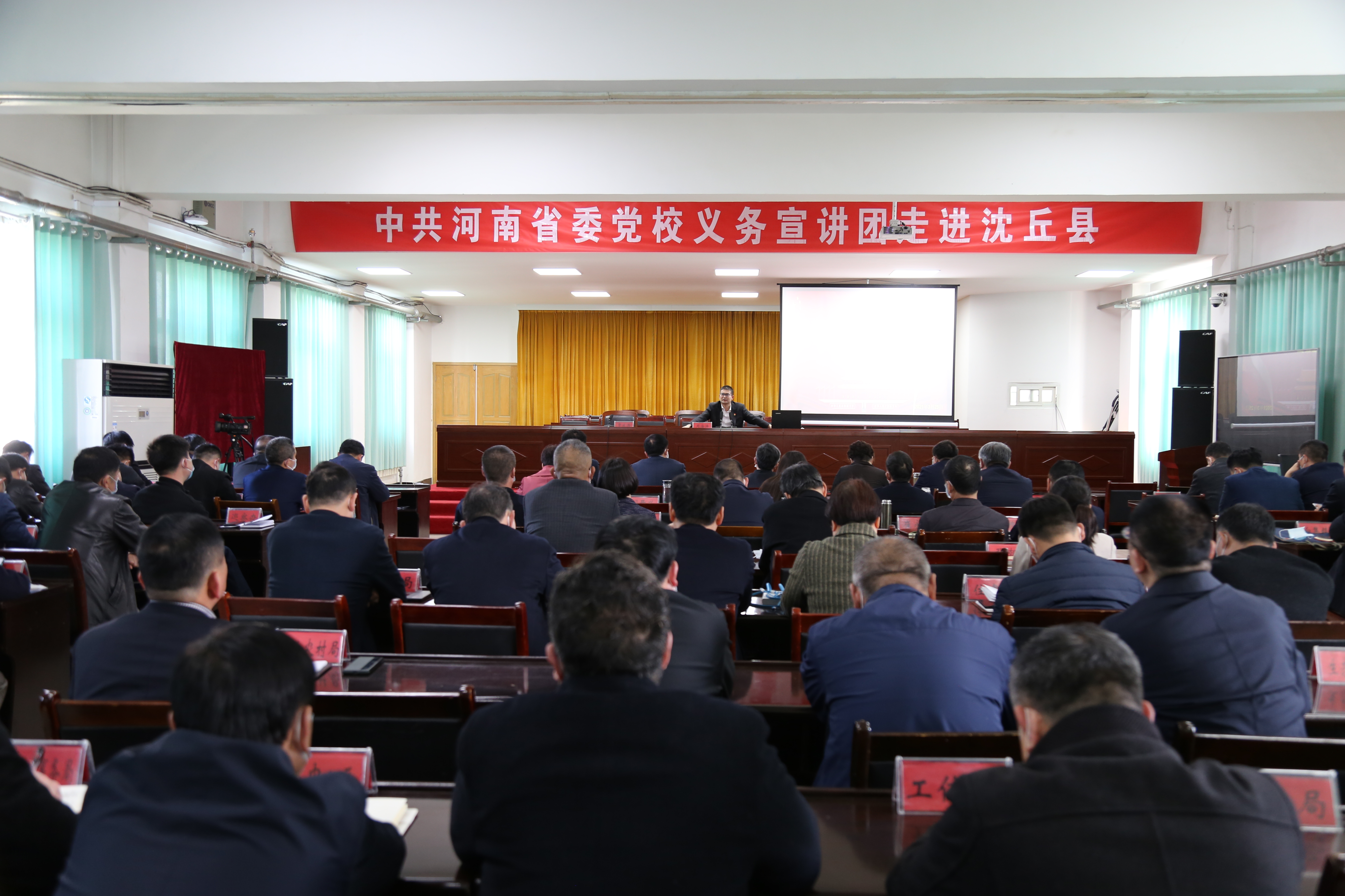 3月25日下午,中共河南省委黨校義務(wù)宣講團(tuán)走進(jìn)沈丘縣開展宣講活動(dòng)?;矢α⑿?、賈慶偉、殷曉春、趙振、郝四春、劉和輝、呂孝坤等在家的縣四個(gè)班子領(lǐng)導(dǎo)及副處級(jí)以上干部與全縣近200余名黨員干部共同聆聽了宣講報(bào)告??h委副書記賈慶偉主持報(bào)告會(huì)。