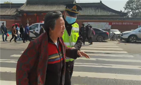 淮陽區(qū)城市交通綜合治理辦公室工作人員幫助行走困難的朝祖群眾。