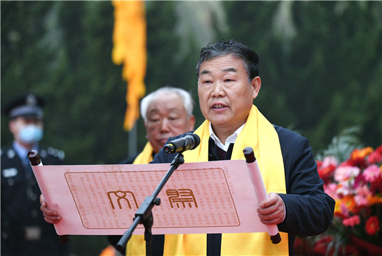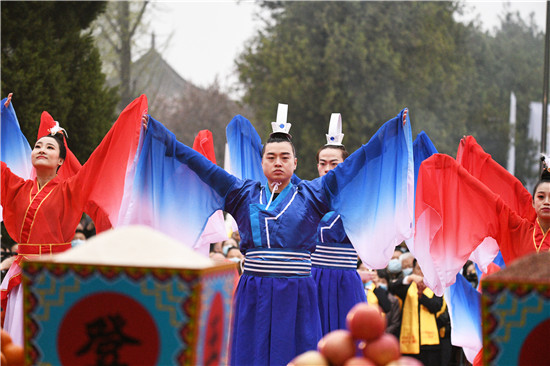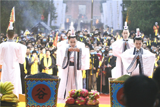 祭祀現(xiàn)場的長條桌上擺著水果和五谷,祭祀活動按照傳統(tǒng)禮儀進(jìn)行,在莊嚴(yán)的古樂及禮炮聲中,先由身著古裝的群體祭祀者以古老禮俗進(jìn)行祭拜,而后進(jìn)行獻(xiàn)爵、恭讀祭文,隨后參加祭祀活動的社會各界代表獻(xiàn)上花籃,依次祭拜,表達(dá)對我們一代先哲的緬懷。