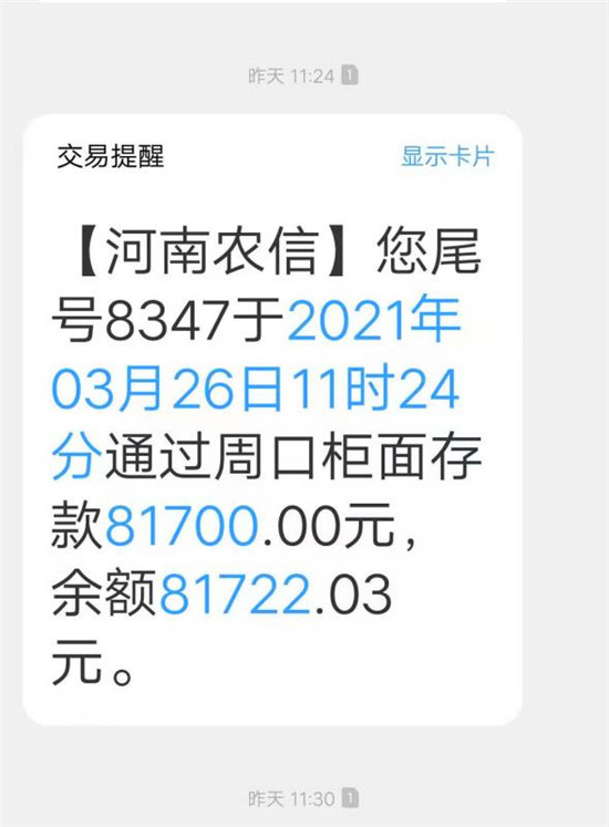 辦完存款手續(xù),記下銀行員工電話,韓永敬冒雨趕往漯河。下午3時許,韓永敬查看手機時,無意看到太康某銀行給其發(fā)來的存款交易信息,卡上莫名多了6萬元。