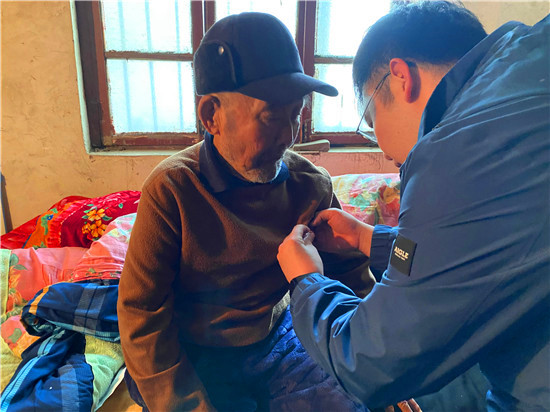 “快,我把你扶起來,年輕黨員來看你啦?!币粊淼蕉盼钠胬先说募抑?,我們就看到杜文奇的老伴在攙扶著杜文奇起來。因?yàn)槟隁q已高,杜文奇身患多種疾病,很多事情已經(jīng)不能清晰地回憶,聽力也減退了,但當(dāng)給杜文奇戴上黨徽時,我們看到他眼含熱淚,仿佛過去64年的黨員生活在面前一一浮現(xiàn)。