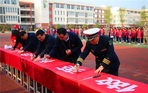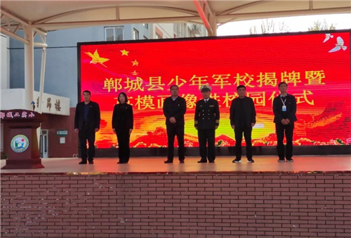 4月8日下午,鄲城縣少年軍校揭牌暨全軍英模畫像進校園儀式在縣第二實驗小學(xué)舉行,縣委常委、縣政府常務(wù)副縣長胡友濤,縣委常委、縣人武部政委金仁旺,縣退役軍人事務(wù)局黨組書記、局長褚章民,共青團縣委副書記、縣少工委書記黃麗莉參加儀式。縣教體局黨組書記、局長羅明黨主持。