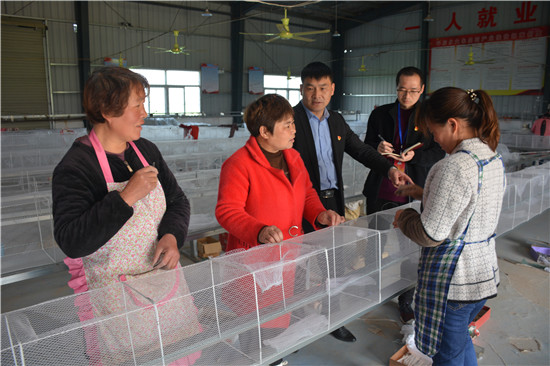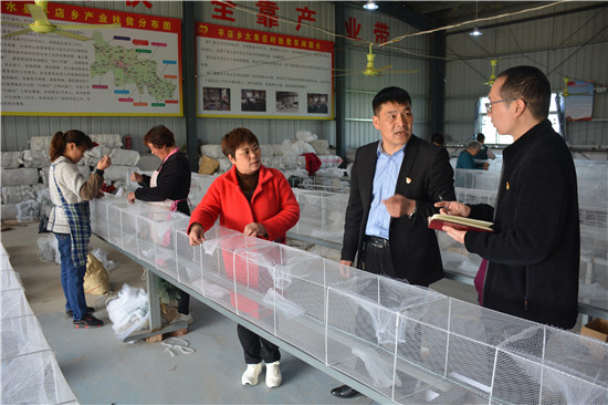 4月11日,商水縣平店鄉(xiāng)大朱莊村扶貧車(chē)間里留守女工正在編織漁網(wǎng)。該縣各級(jí)紀(jì)檢部門(mén)切實(shí)加強(qiáng)對(duì)扶貧資金資產(chǎn)的監(jiān)督管理,確保了扶貧項(xiàng)目產(chǎn)業(yè)正常運(yùn)行,有效促進(jìn)了廣大留守婦女家門(mén)口就業(yè)增收。圖為縣鄉(xiāng)紀(jì)委干部在扶貧車(chē)間調(diào)查了解資產(chǎn)管理群眾收益工人收入等情況。