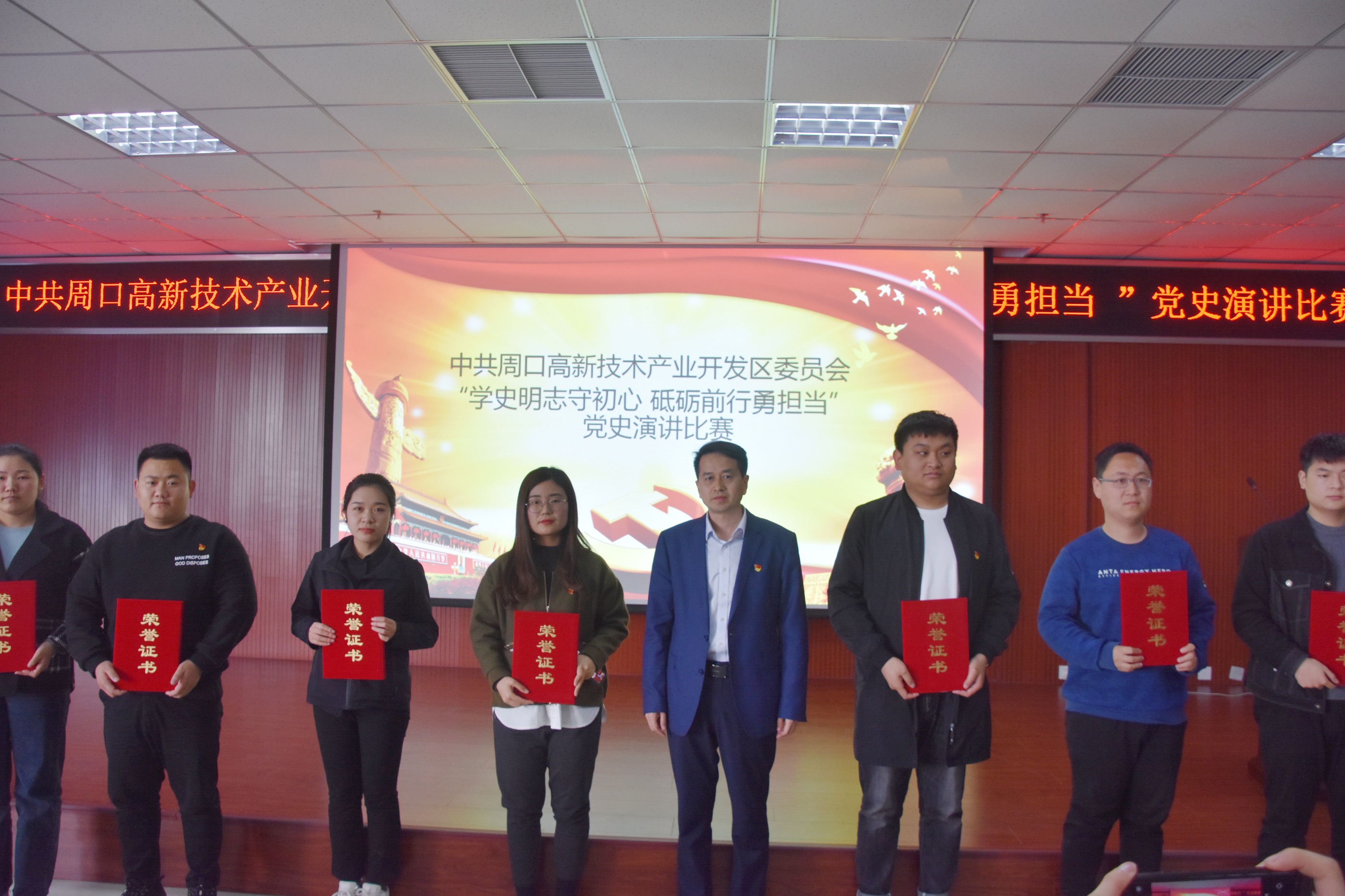 為開展中共黨史學(xué)習(xí)教育,全面總結(jié)和展示中國共產(chǎn)黨團結(jié)奮斗、風(fēng)雨同舟的光輝歷程,激勵全體黨員不忘初心、牢記使命,4月14日,周口高新區(qū)黨委舉行“學(xué)史明志守初心 砥礪前行勇?lián)?dāng)”演講比賽。17個黨支部代表參加。比賽中,參賽選手結(jié)合崗位實際,用真摯的感情、樸實生動的語言從不同角度抒發(fā)了對黨的忠誠和熱愛,展現(xiàn)出濃厚的愛國愛黨情懷和強烈的使命擔(dān)當(dāng)。選手的優(yōu)秀表現(xiàn),不時引來觀眾陣陣掌聲。