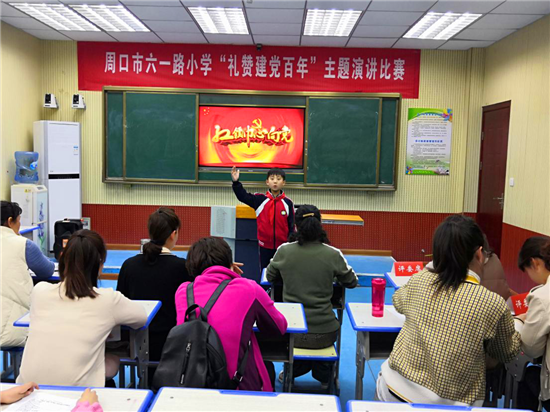 “中國(guó)共產(chǎn)黨是偉大的黨、崇高的黨、奮進(jìn)的黨,百年歷程、百年輝煌;沒有共產(chǎn)黨就沒有新中國(guó);我驕傲,我是中國(guó)人;我們要努力學(xué)習(xí)、奮發(fā)向上、為黨增光、為黨添彩……”周口市六一路小學(xué)舉辦“禮贊建黨百年”主題演講比賽,參賽選手回顧黨的光輝歷程、弘揚(yáng)黨的豐功偉績(jī),表達(dá)對(duì)中國(guó)共產(chǎn)黨的熱愛和贊頌,以各自獨(dú)特的見解給師生們進(jìn)行了一次生動(dòng)的理想信念教育。