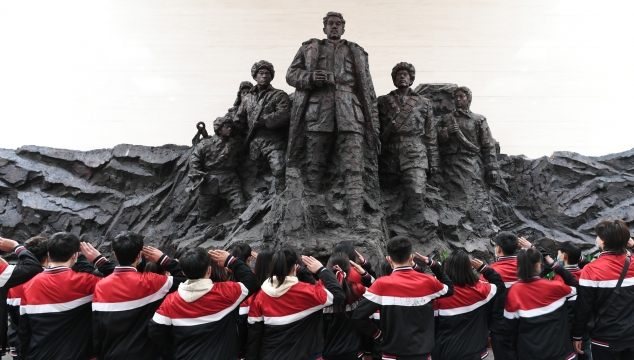 高聳的紅軍烈士紀念塔,狀如一顆緊弦待發(fā)的炮彈,矗立在五角星形的塔座上。在紀念碑與檢閱臺之間的地面上,“踏著先烈血跡前進”八個蒼勁大字格外醒目。