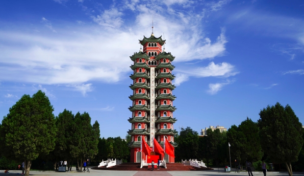 在甘肅省白銀市會寧縣紅軍會寧會師舊址內,有一座高33.33米,呈三塔環(huán)抱雄姿的紀念塔——中國工農紅軍第一二四方面軍會師紀念塔。