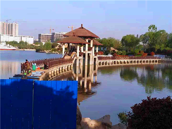 近日,位于文昌大道的周口公園啟動了對水上棧道的維修。周口公園的水上棧道和亭榭是一道美麗的風景,成為人們游園打卡之地,然而因建造時用的是木材,歷經(jīng)風雨,朽壞嚴重,存在安全隱患,周口公園方面于去年將之封閉。記者在現(xiàn)場看到,工人已經(jīng)將木質(zhì)扶欄、道上木板拆除,正在安裝鐵護欄。鐵護欄油漆成棕褐色,依然保持原棧道的風格和色調(diào)。②7