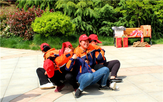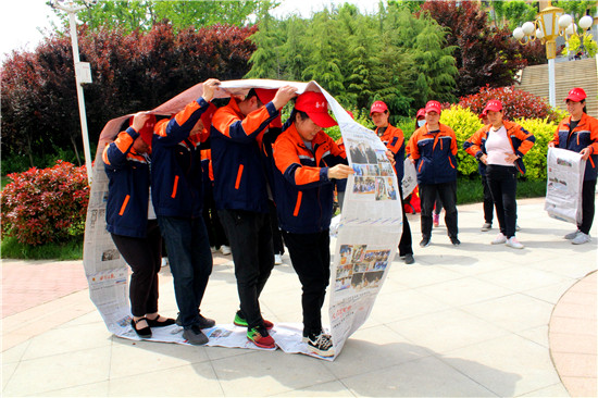 在同舟共濟游戲環(huán)節(jié),4人一組,分成6組,將20張報紙用膠帶制作成一個大圓環(huán),將圓環(huán)立起來,4名隊員依次站到圓環(huán)內(nèi)報紙上,邊走邊滾動大圓環(huán),他們站著的地面就像是一片汪洋大海,而這個報紙圓環(huán)則代表汪洋大海中的一條小船,他們“劃船”而行,小“船”中途破了,便視為失敗,用時最短、速度最快者為勝。只見各組隊員齊心協(xié)力,有條不紊,推動著圓環(huán)向前滾動,助威聲,吶喊聲,響成一片,歡聲笑語,不絕于耳。
