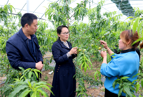 圖為張福麗博士查看李紅彥家大棚油桃長(zhǎng)勢(shì)。