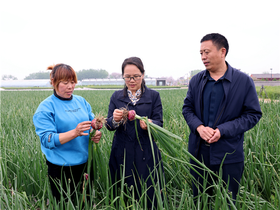 圖為張福麗博士查看李紅彥家洋蔥抗病情況。