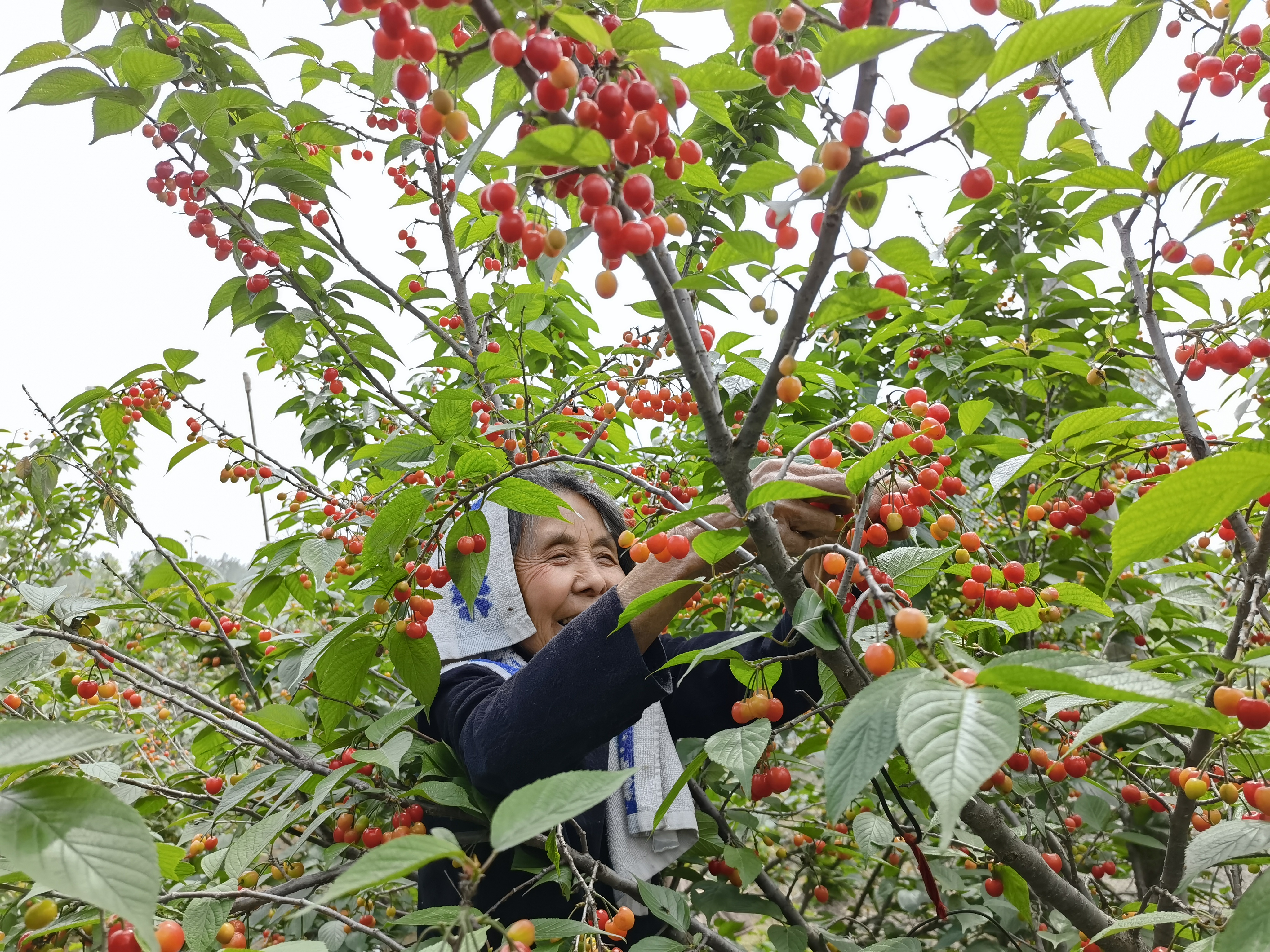 櫻桃林深處,一位摘櫻桃的老奶奶吸引了記者的注意。只見(jiàn)老奶奶手腳麻利,摘得飛快,不一會(huì)兒旁邊的籃子就裝滿了櫻桃?!澳棠毯茫∧衲旮邏垩??”“閨女,我86啦!”老奶奶聲音洪亮,耳聰目明。交談中得知,老奶奶名叫胡芝榮,是名老黨員,年輕時(shí)當(dāng)過(guò)婦女隊(duì)長(zhǎng)?!澳憧催@櫻桃長(zhǎng)得多好!我想起了以前的那個(gè)時(shí)候沒(méi)飯吃,別說(shuō)櫻桃了,樹(shù)葉子、樹(shù)皮都吃光了!”老奶奶紅了眼眶,她用手揉了揉,接著說(shuō):“現(xiàn)在黨的政策好,在家摘摘櫻桃就有錢賺,來(lái)我們這兒旅游的人也越來(lái)越多,日子越來(lái)越好!”