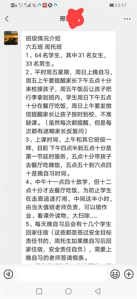 2、平時周五星期,周日上晚自習(xí),周五上午要提醒家長下午五點(diǎn)十分來校接孩子,周五午飯后讓孩子把行李拿到班內(nèi),學(xué)生周日下午五點(diǎn)十分在餐廳吃飯,周日上午要發(fā)微信提醒家長讓孩子按時到校,不準(zhǔn)缺課。(雖然每次都提醒,但是每次都有迷糊家長反復(fù)問)