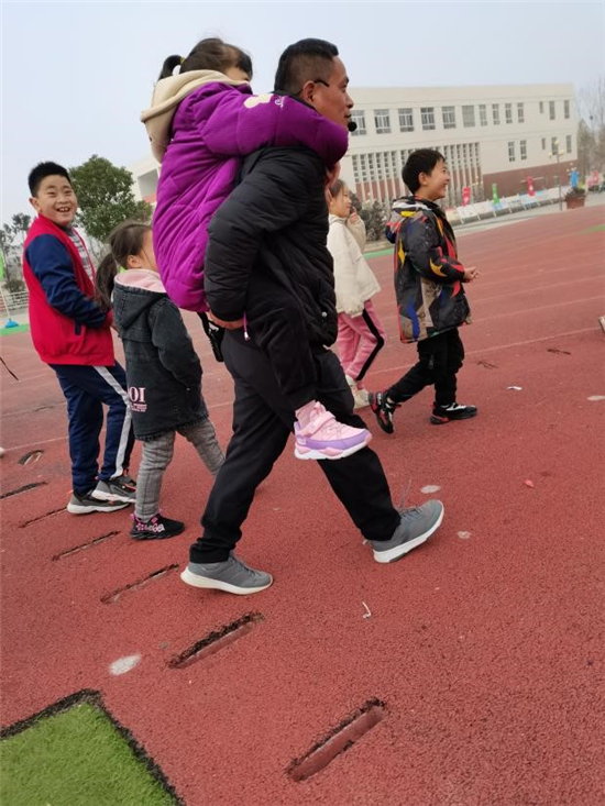 還有“背著孩子送路隊(duì)是常有的事兒”。例如馬洪梅老師、胡瑞老師、李志強(qiáng)老師,在大雨磅礴的傍晚,在冰天雪地的寒冬,他們穿著膠鞋,深一腳淺一腳,背著個頭小的學(xué)生,護(hù)送班級另外幾十個孩子。那溫暖的臂膀,背上撐傘的孩子,看上去儼然就是一對親密的父子、母子。