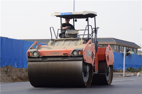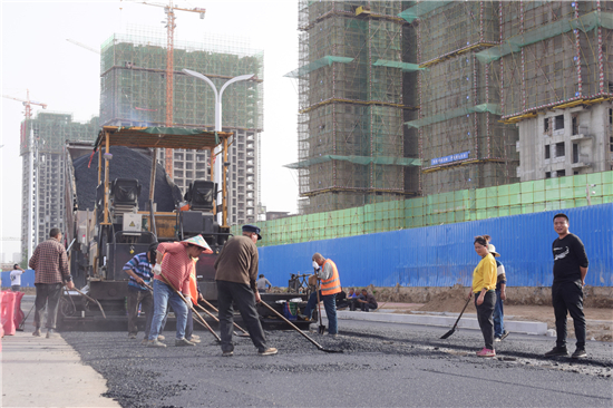 西側(cè)的非機(jī)動(dòng)車道正在最后的柏油鋪設(shè)