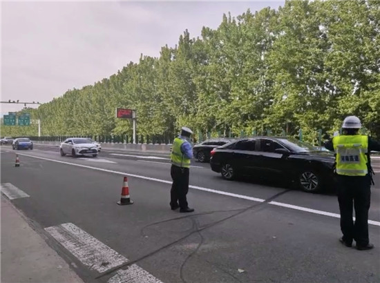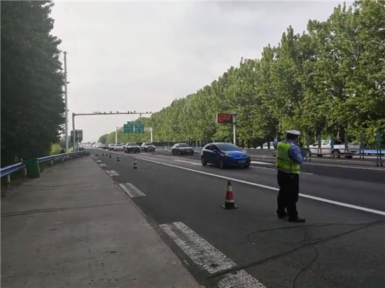 圖片說(shuō)明:交警在大廣高速與商南高速互通立交南2062公里附近指揮交通