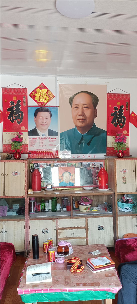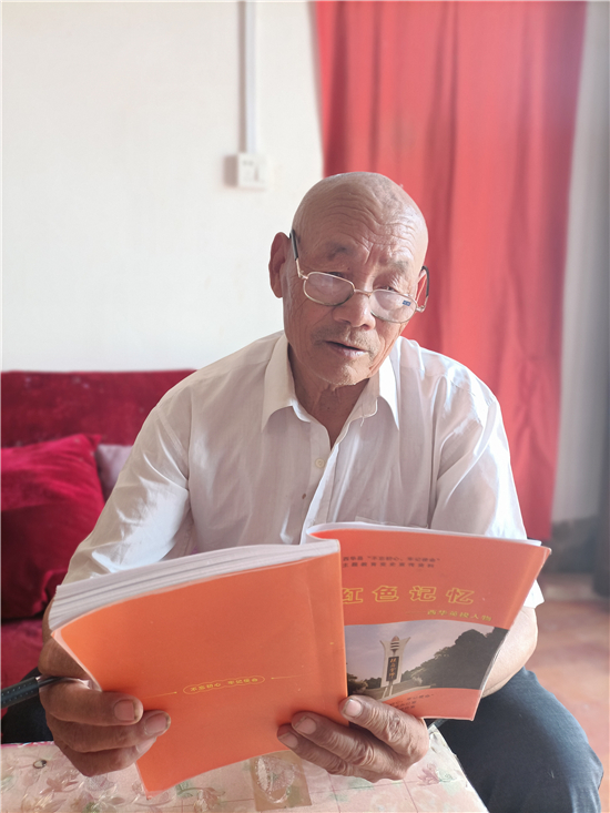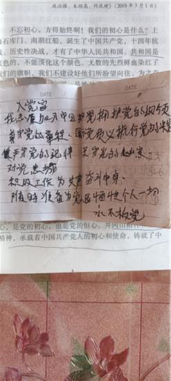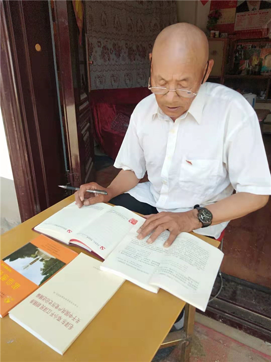“老王,記者來(lái)采訪你了?!边M(jìn)得庭院,一同前往的西王營(yíng)行政村婦聯(lián)主任王玉真高聲叫道。聽(tīng)到有人前來(lái),正在屋內(nèi)看書(shū)的王加科放下書(shū)本走了出來(lái),熱情地把我們往屋里讓,他胸前佩戴的毛主席像張和黨徽在陽(yáng)光的照耀下閃閃發(fā)光,“從我嫁到這里,覺(jué)得老王胸前的毛主席像章就沒(méi)有摘掉過(guò)?!蓖跤裾嬉贿呑咭贿呎f(shuō)道。堂屋正中央的墻壁上端端正正的懸掛著毛澤東主席和習(xí)近平總書(shū)記畫(huà)像,畫(huà)像下方一張方桌、一對(duì)沙發(fā)和一個(gè)條幾就是全部家具。小方桌上放著《習(xí)近平關(guān)于“不忘初心 牢記使命”論述摘編》和《紅色記憶》兩本書(shū)籍和一大一小兩個(gè)筆記本。老人拿起那個(gè)已經(jīng)發(fā)黃破舊的小筆記本說(shuō),那個(gè)小本子已經(jīng)陪他好多年了,小筆記本的扉頁(yè)上是王加科老人多年前抄寫(xiě)的“入黨誓詞”,最后的紙張上寫(xiě)著“不忘初心,永遠(yuǎn)緊跟共產(chǎn)黨,黨指揮到哪里,我就跟到哪里”,翻開(kāi)《習(xí)近平關(guān)于“不忘初心 牢記使命”論述摘編》,里面許多文字下面劃了橫杠,“我的文化程度不高,還是在部隊(duì)學(xué)會(huì)了一些字,許多字不會(huì)寫(xiě),就在重要的內(nèi)容下面用符號(hào)標(biāo)記,筆記上的好多字和符號(hào)你們認(rèn)不出來(lái),但是我自己知道。”看記者拿起書(shū)籍翻看,王家科老人似乎有些不好意思的說(shuō)到,“不論到啥時(shí)候,入黨誓詞不能忘,要時(shí)刻記在心里,要始終以百姓的心為心?!?/p>