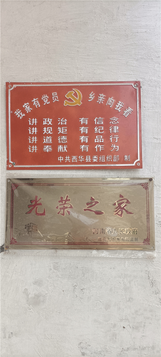 王加科的家位于西王營(yíng)行政村的東北角,三間上世紀(jì)90年代蓋的瓦房與鄰居蓋起的樓房相比顯得有些低矮。大門上的固定著兩個(gè)金屬牌子,一個(gè)是一個(gè)是河南省人民政府為軍屬頒發(fā)的“光榮之家”均屬牌,一個(gè)是中共西華縣委組織部制作的上書(shū)有“我家有黨員 鄉(xiāng)親向我看”的“四講四有”牌子。進(jìn)得大門,只見(jiàn)不大的院子整理的井井有條,一條青磚鋪成的小道直通向堂屋,小道兩邊栽種著各種蔬菜。