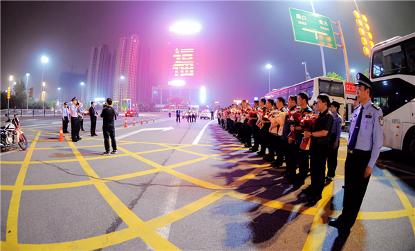 5月14日22時(shí),商水縣在寧洛高速周口南站口舉行隆重的歡迎儀式,迎接外出執(zhí)行抓捕任務(wù)凱旋的民警輔警。縣委副書記張峰,縣人大常委會(huì)副主任楊新權(quán),縣政協(xié)副主席劉萬華,縣政府黨組成員、公安局長王之棟等出席儀式??h公安局黨委班子成員、局直警種負(fù)責(zé)人和民警代表參加了活動(dòng)。