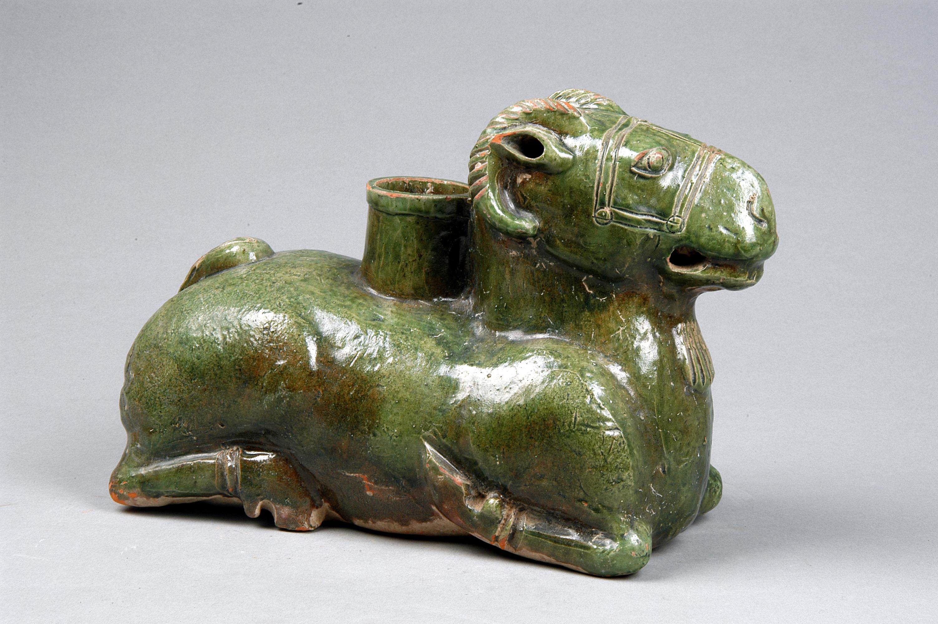 什么叫“尊”呢,就是你們現(xiàn)在說的酒杯。我就是用來喝酒的容器。關(guān)于造型呢,別期待我硬朗干練,我是寓意吉祥的一只小羊,是溫順善良的化身,線條流暢,神采奕奕。我身長(zhǎng)36.6厘米,寬15.8厘米,高23厘米,口徑5.4厘米,臥姿跪地,嘴巴微張,紅陶質(zhì)地,綠釉作為裝飾色彩,遍布全身,釉色碧綠明凈,是漢代鉛釉陶中的珍品。