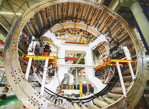 鄭州市經(jīng)開(kāi)區(qū)中鐵工程裝備集團(tuán)有限公司生產(chǎn)車間,工人在加緊生產(chǎn)。2009年在鄭州成立的中鐵裝備,目前已是中國(guó)最大的隧道掘進(jìn)機(jī)制造服務(wù)商。 聶冬晗攝(中經(jīng)視覺(jué))