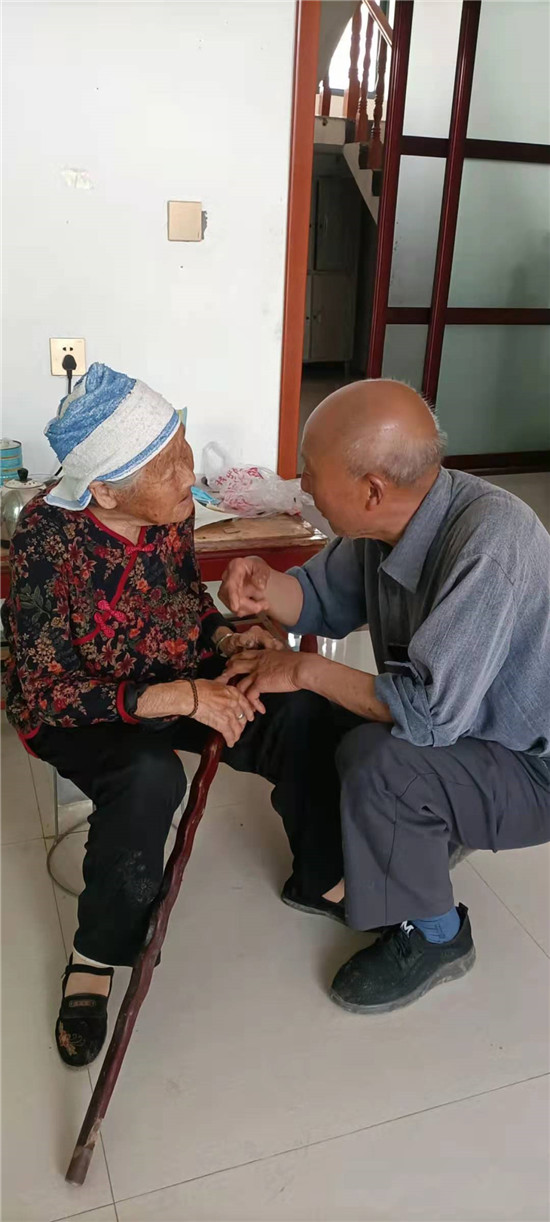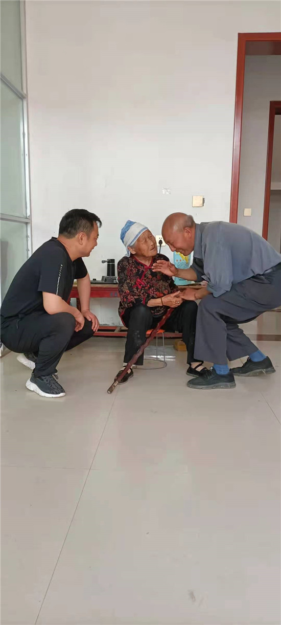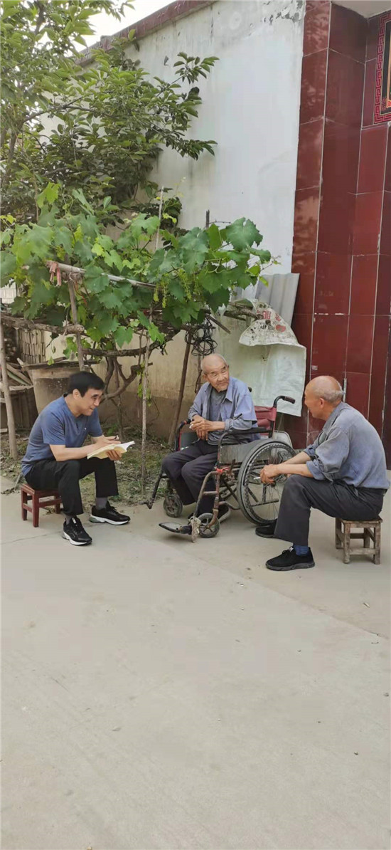 西華縣退役軍人事務局工作人員陪同薛景洪走訪知情老人。