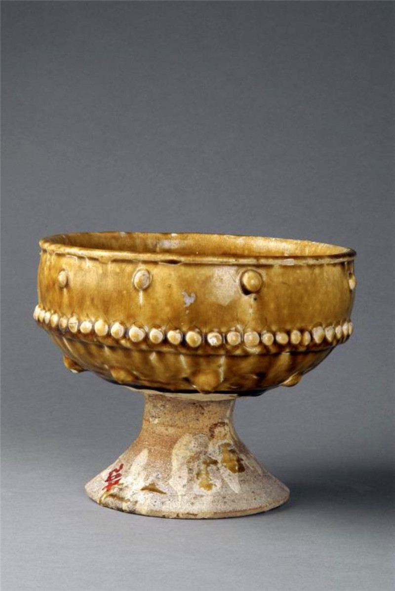 這件唐代壽州窯黃釉乳釘紋豆,1958年4月出土于今河南周口市沈丘縣槐店鎮(zhèn)。沈丘槐店鎮(zhèn),古稱項、北揚州,從春秋戰(zhàn)國、魏晉南北朝到唐代的1600多年間,一度作為豫東、皖北的政治和經(jīng)濟文化中心,歷史悠久,文化燦爛,餐飲業(yè)尤為發(fā)達。沈丘槐店出土的這件黃釉乳釘紋豆的精美程度應當不是尋常百姓家所能擁有,而是唐代“上流社會”所用之器。