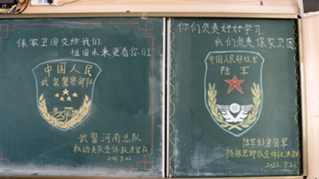 ??“保家衛(wèi)國交給我們,祖國未來更看你們!”“你們負(fù)責(zé)好好學(xué)習(xí),我們負(fù)責(zé)保家衛(wèi)國!”在鄭州市第七十三中學(xué)的一間教室里,參與救災(zāi)援助的抗洪官兵們給同學(xué)們留下了兩幅黑板報(bào)。在師生們眼里,這就是名副其實(shí)的“最美黑板報(bào)”。