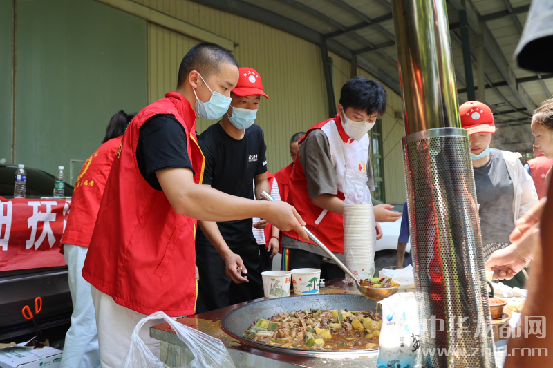 26日早上,他們開著皮卡來到目的地:扶溝縣力神機械有限責任公司。這是一個臨時救災服務點,有救災服務人員百余人,飲食供應不上。見到此情此景,他們迅速整理食材,搭起灶臺,燒火洗菜,做了一大鍋土豆炒雞塊,然后拿出事先準備好的一次性餐具和饅頭,把大鍋菜分成60余份分給志愿者……肉的香味撲鼻而來,吸引了附近的志愿者前來就餐??吹酱蠡锒紱]有吃飯,他顧不得擦汗,立即炒好第二鍋、第三鍋。