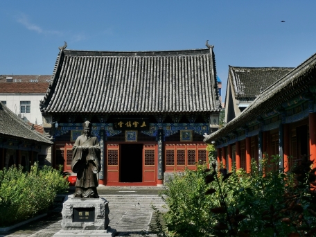 穿過文場,迎面為程顥塑像。程顥塑像之后就是書院主體建筑立雪講堂,是師長講學(xué)授業(yè)的場所,是舉行重大活動的場所。講堂大門上方懸掛著名書法家吳三大題寫匾額“立雪講堂”四個(gè)大字,大門兩側(cè)還懸掛楹聯(lián)“立雪見精誠,樹尊師以令范;設(shè)堂明理性,遺重教之高風(fēng)”一副。