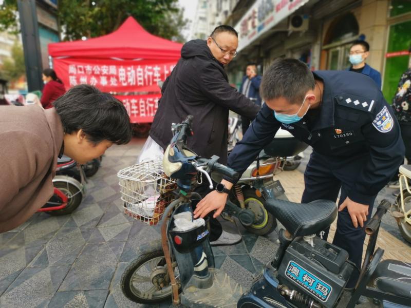 在中心城區(qū)交通大道與五一路交叉口的陳州辦事處電動(dòng)自行車上牌處,不少車輛已經(jīng)上過牌照停放在規(guī)定地點(diǎn)?!拔沂乔疤焐系呐普?,家里需要,我就買了輛新電動(dòng)自行車,各項(xiàng)材料齊全,拿到上牌點(diǎn)很快就完成了上牌。”家住附近的市民李女士說。