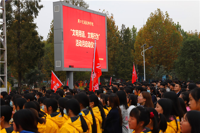 “我是周口交通技師學(xué)院的一名學(xué)生,從今天起,我要講禮儀、懂禮貌、不說臟話……積極參加“文明用語、文明行為”主題實(shí)踐活動(dòng),爭做文明學(xué)生?!?0月26日,周口交通技師學(xué)院全體師生在學(xué)院“文明用語、文明行為”活動(dòng)月動(dòng)員會(huì)上集體宣誓。師生們堅(jiān)定的目光和錚錚的誓言,展現(xiàn)出青年學(xué)子講文明話、辦文明事、做文明人的堅(jiān)定決心。