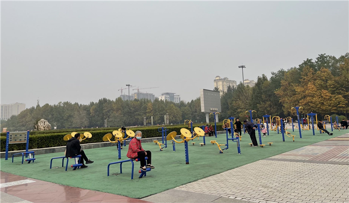 市民在市開發(fā)區(qū)人民廣場(chǎng)健身器材處鍛煉身體